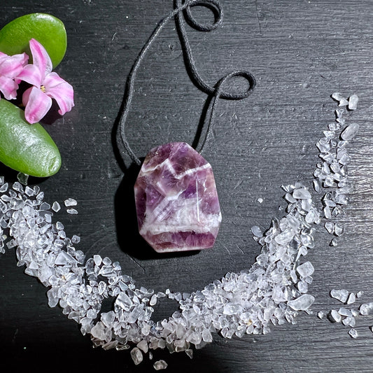 Amethyst Anhänger, gebohrtes Polygon, Dream Amethyst 35x27mm mit Band