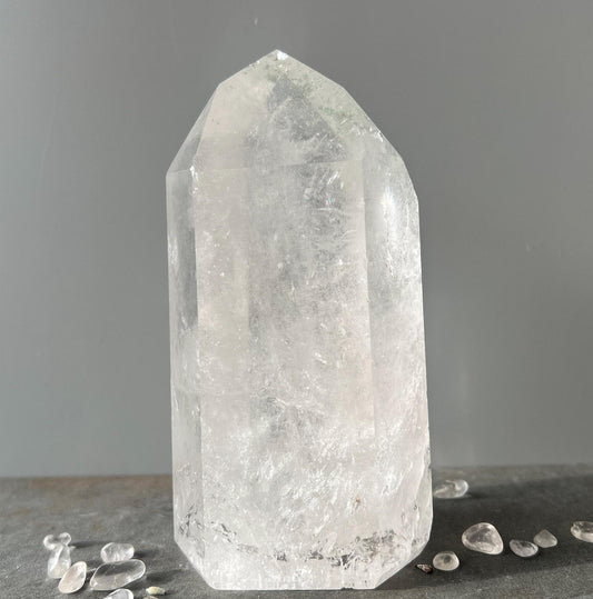 Shamanic quartz, rock crystal tower with chlorite inclusions, 1160g, garden quartz point.
